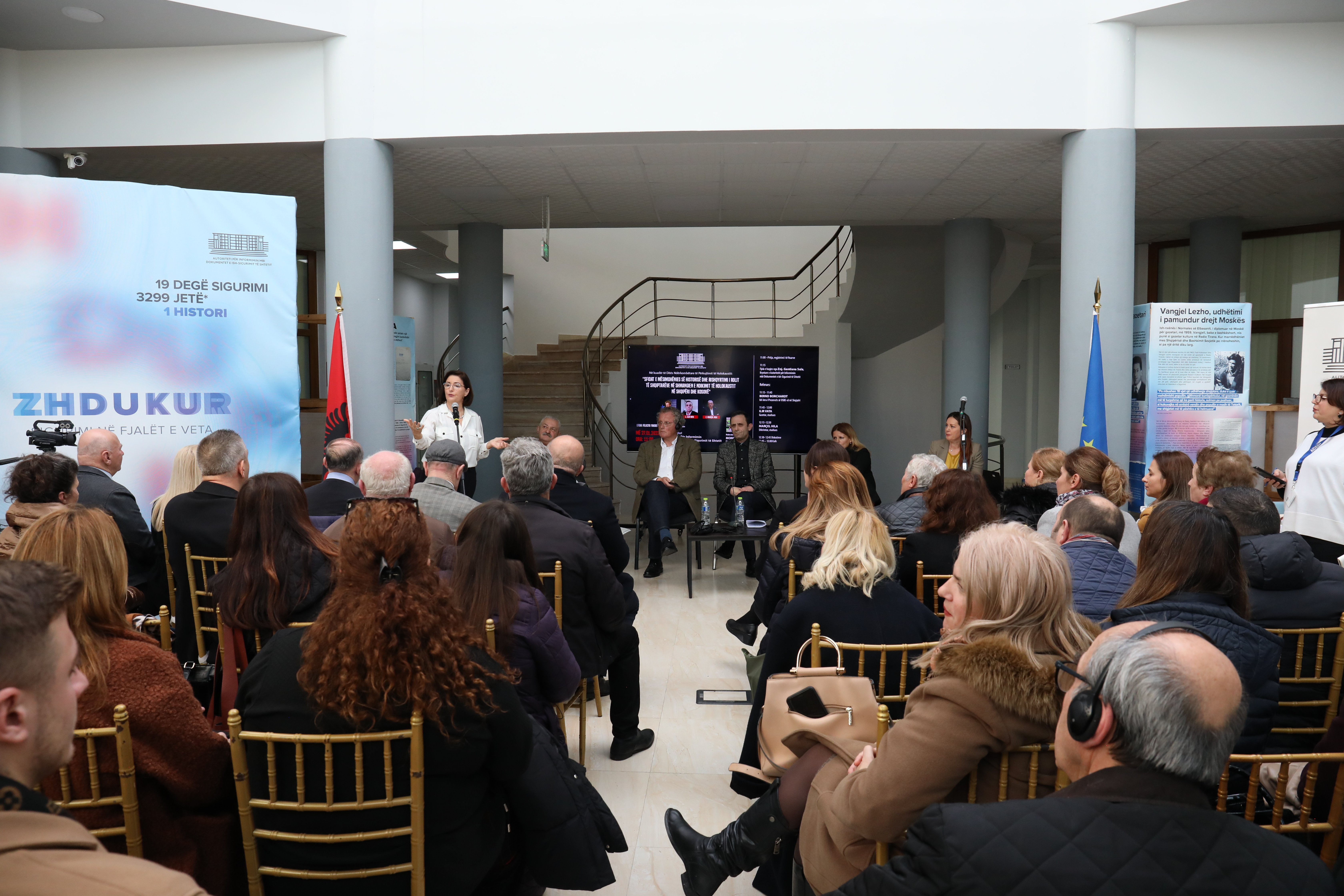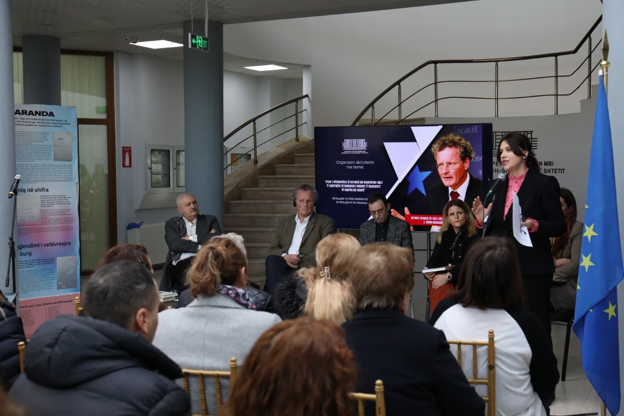 Tiranë 27.01.2023 – Në Ditën Ndërkombëtare të Përkujtimit të Holokaustit, Autoriteti për Informim mbi Dokumente të ish- Sigurimit të Shtetit me praninë e trupit diplomatik, partnerëve, përfaqësuesve të Ministrisë së Arsimit, Sportit dhe Rinisë, mësuesve të historisë dhe edukimit qytetarë, kërkuesve shkencorë dhe medias zhvilluan aktivitetin me temë: “𝑆𝑓𝑖𝑑𝑎𝑡 𝑒 𝑚𝑒̈𝑠𝑖𝑚𝑑ℎ𝑒̈𝑛𝑖𝑒𝑠 𝑠𝑒̈ ℎ𝑖𝑠𝑡𝑜𝑟𝑖𝑠𝑒̈ 𝑑ℎ𝑒 𝑟𝑜𝑙𝑖 𝑖 𝑠ℎ𝑞𝑖𝑝𝑡𝑎𝑟𝑒̈𝑣𝑒 𝑛𝑒̈ 𝑠ℎ𝑚𝑎𝑛𝑔𝑖𝑒𝑛 𝑒 𝑛𝑑𝑖𝑘𝑖𝑚𝑖𝑡 𝑡𝑒̈ 𝐻𝑜𝑙𝑜𝑘𝑎𝑢𝑠𝑡𝑖𝑡 𝑛𝑒̈ 𝑆ℎ𝑞𝑖𝑝𝑒̈𝑟𝑖 𝑑ℎ𝑒 𝐾𝑜𝑠𝑜𝑣𝑒̈”. Me këtë rast u ekspozuan një sërë dokumentesh të krijuar nga ish-Sigurimi i Shtetit për hebrenjtë.
